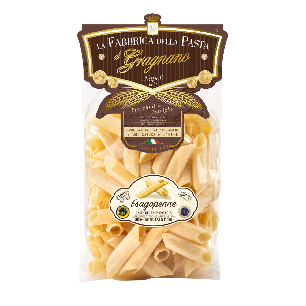 A surprising shape that combines creativity with the quality of pasta-making tradition, distinguished by its pointed tip and hexagonal design.
